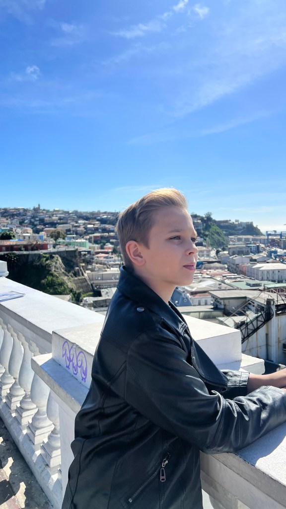 We stayed in Santiago but did a day trip to Valparaíso. Jeff got sick that day, so Zac and I learned to use the public bus system. It was so easy! We rode a nice bus to Valparaíso’s bus depot, but once there, we had to take the town’s smaller (sketchier, if I can say that) bus to the town square. There was a market that day, and after a quick peek at artisan goods, we found the funicular, or mountain elevator, we needed to get to the top of Cerro Alegre, which overlooked the Pacific.